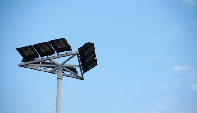 操场采用2根12米高杆、一根高杆装9盏150Wled投光灯;